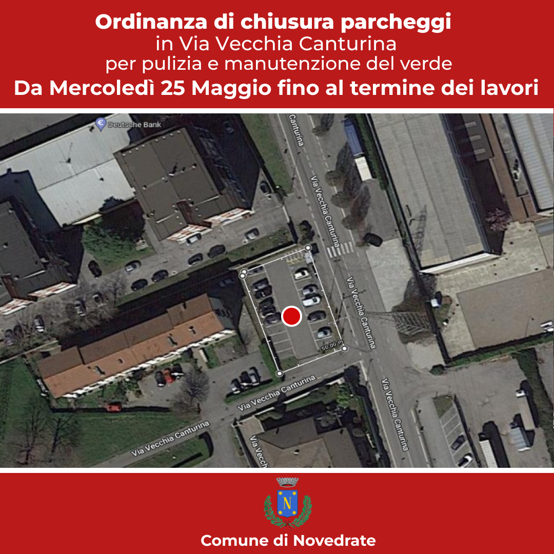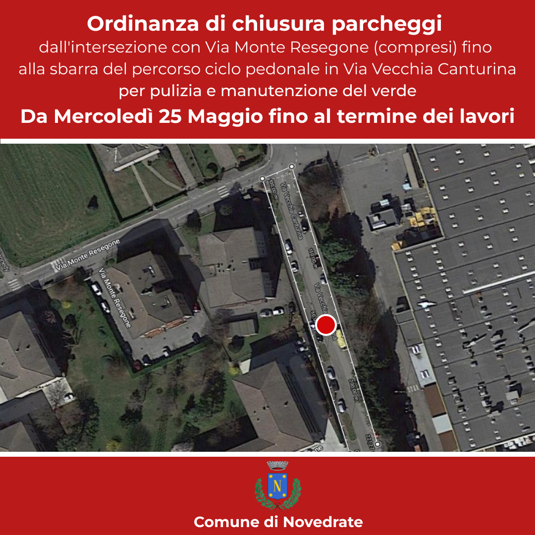 Istituzione di divieto di sosta temporaneo con rimozione forzata dei parcheggi di Via Vecchia Canturina ( tra il civico 4 - A/B e il Civico 14) e i parcheggi dall'intersezione con Via Monte Resegone (compresi) fino alla sbarra del percorso ciclo pedonale per manutenzione e pulizia del verde.