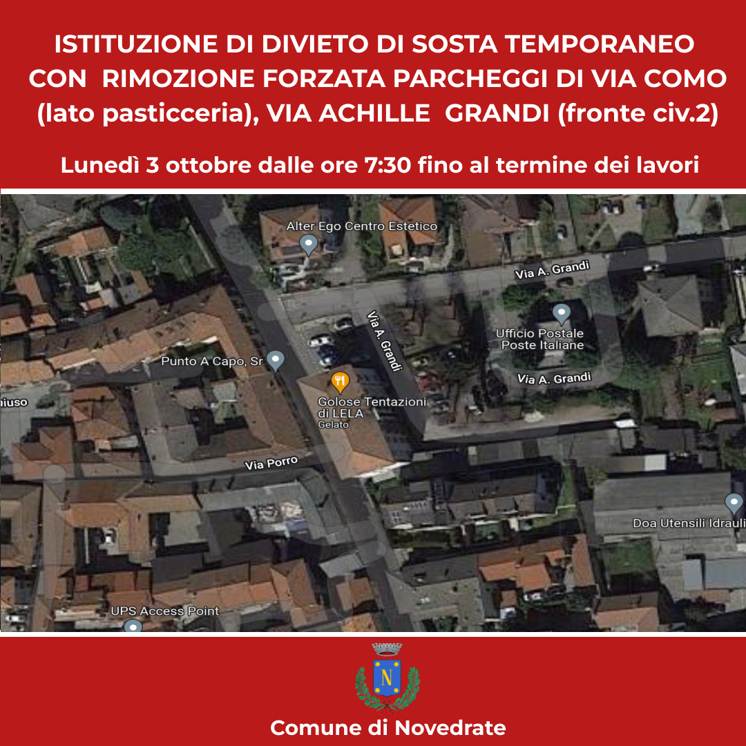 Istituzione di divieto di sosta temporaneo con rimozione forzata parcheggi di Via Como e Via Achille Grandi per pulizia parcheggio e taglio manutenzione verde