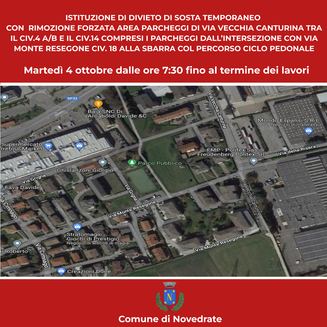 Istituzione di divieto di sosta temporaneo con rimozione forzata area parcheggi di Via Vecchia Canturina tra il civ. 4-a/b e il civ. 14, compresi i parcheggi dall'intersezione con Via Monte Resegone civ. 18 alla sbarra del percorso ciclo pedonale per pulizia parcheggio e taglio manutenzione verde
