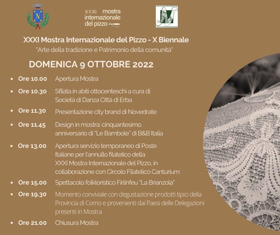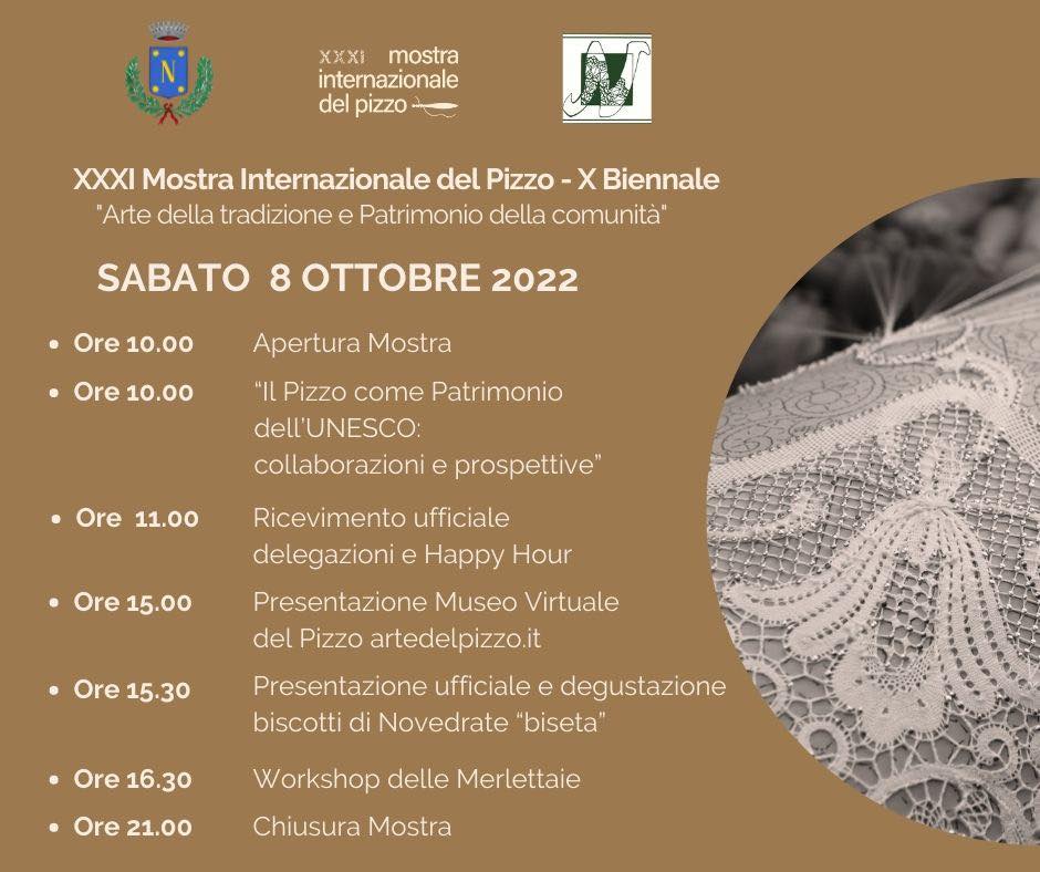 Ore 10.00 Apertura MostraOre 10.00 “Il Pizzo come Patrimonio dell’UNESCO: collaborazioni e prospettive”Ore 11.00 Ricevimento ufficiale delegazioni e Happy HourOre 15.00 Presentazione Museo Virtuale del Pizzo artedelpizzo.itOre 15.30 Presentazione ufficiale e degustazione biscotti di Novedrate “biseta”Ore 16.30 Workshop delle MerlettaieOre 21.00 Chiusura Mostra