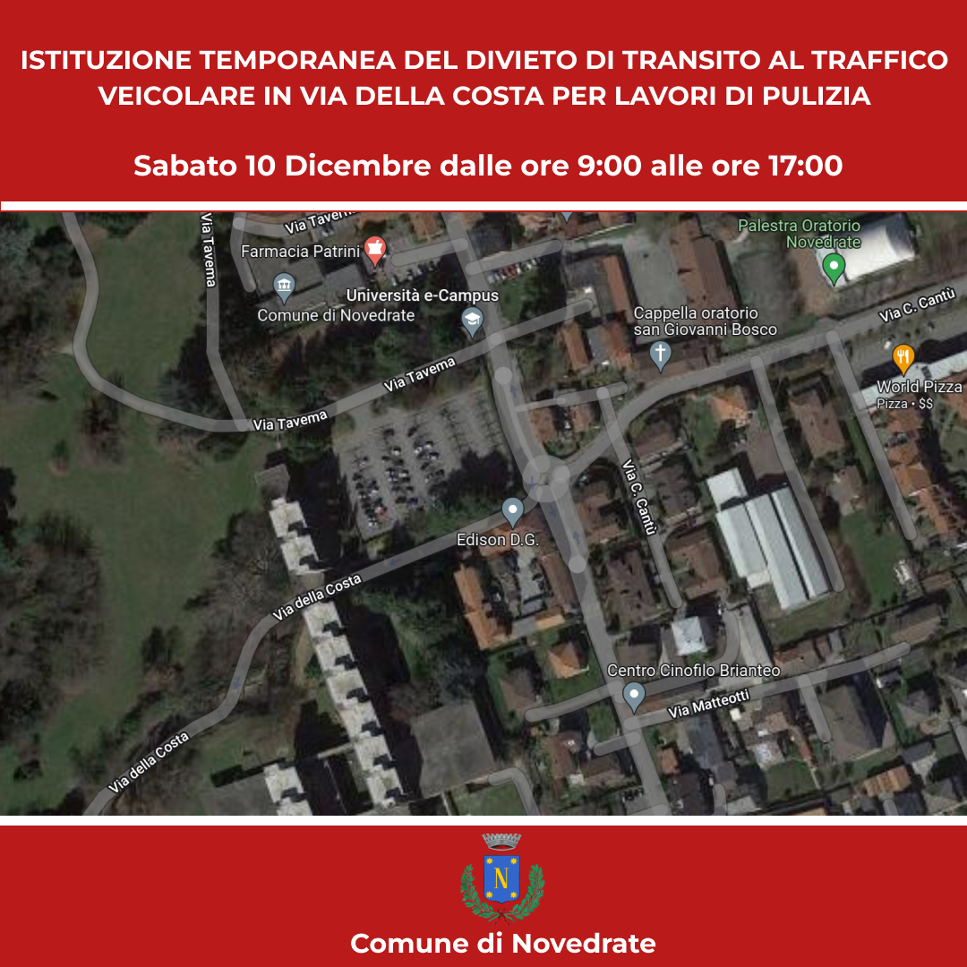 Istituzione temporanea del divieto di transito al traffico veicolare in Via della Costa per lavori di pulizia degli infissi presso l'Università E-Campus