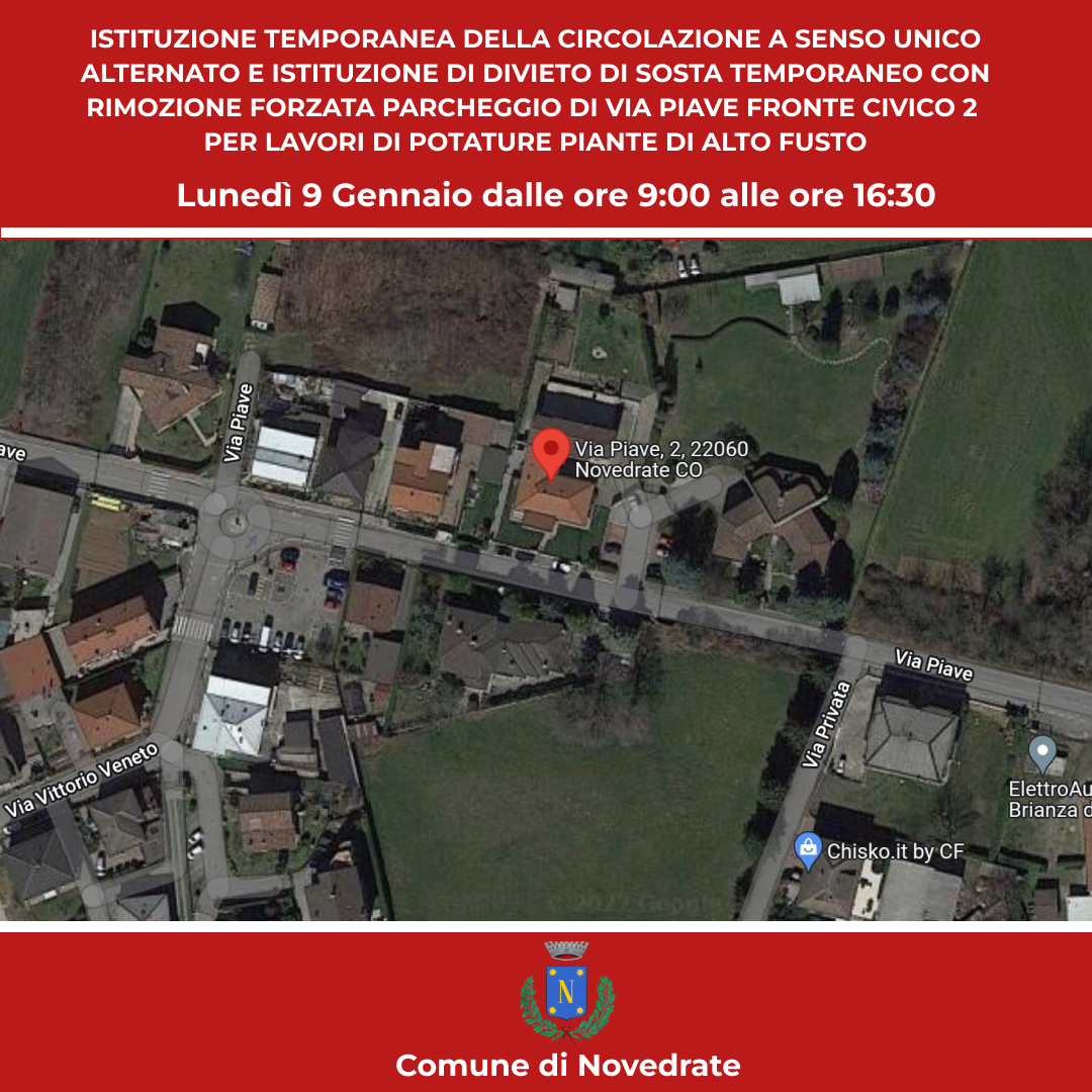 Regolamentazione della circolazione stradale, istituzione temporanea della circolazione a senso unico alternato e istituzione di divieto di sosta temporaneo con rimozione forzata parcheggio di Via Piave fronte civico 2 per lavori di potature piante di alto fusto