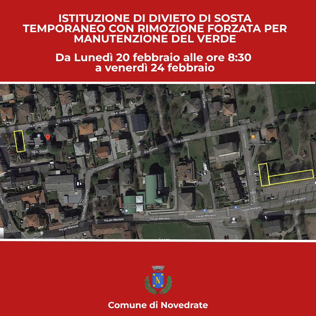 Istituzione di divieto di sosta temporaneo con rimozione forzata presso parcheggi di Via Achille Grandi Civ.2, Via Mariano fronte civ.8-10 e Via Mariano fronte civ,21-29 per manutenzione del verde e potatura piante di alto fusto