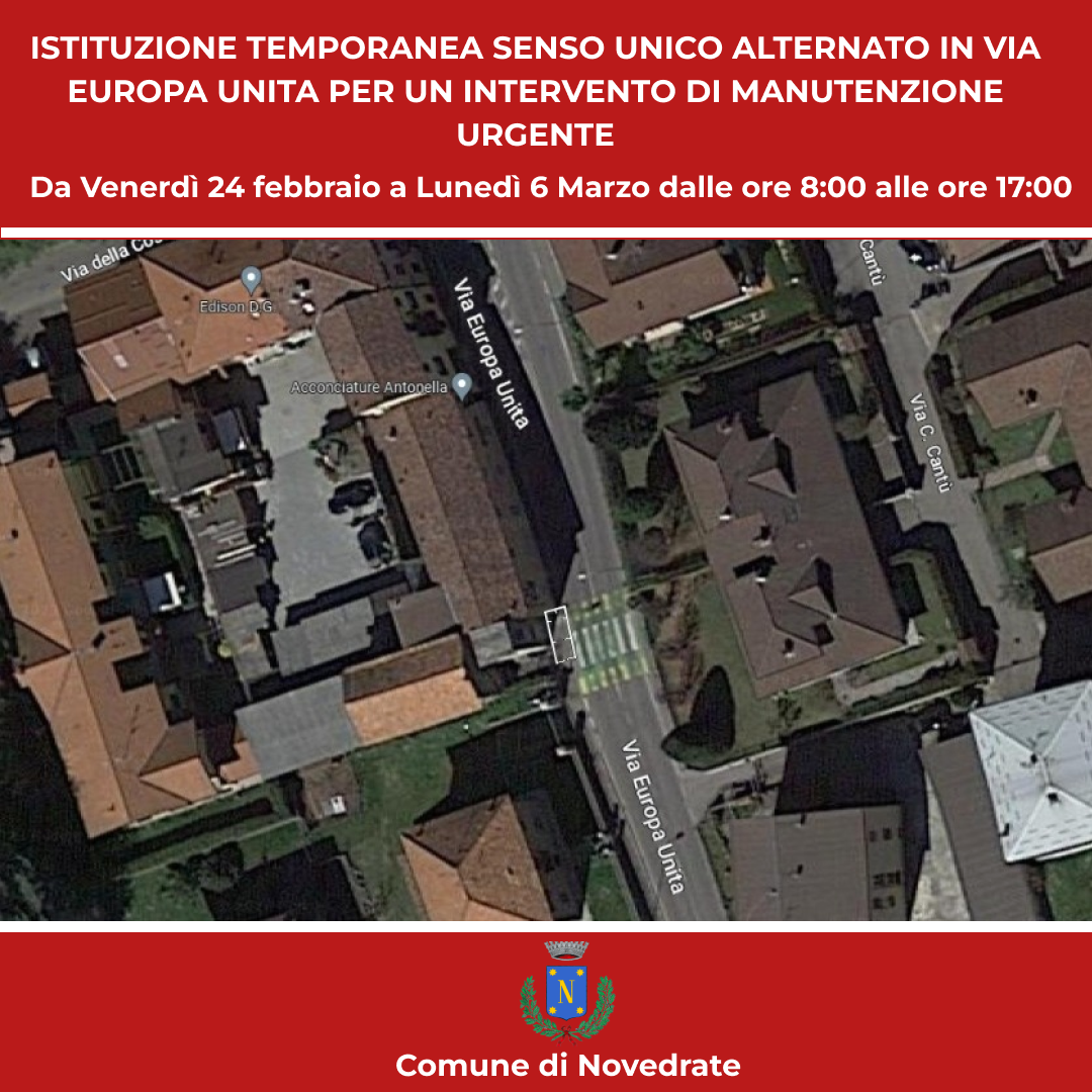 Istituzione temporanea senso unico alternato in Via Europa Unita in corrispondenza civ.10 per intervento di manutenzione urgente delle facciate della cabina elettrica E-Distribuzione