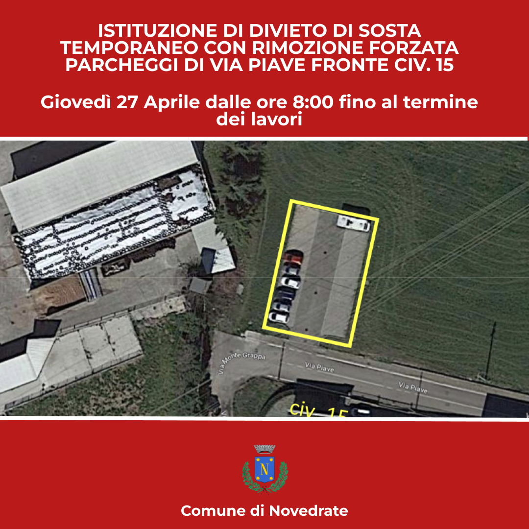 Istituzione di divieto di sosta temporaneo con rimozione forzata parcheggi di Via Piave intersezione Via Vittorio Veneto per pulizia parcheggio e taglio manutenzione verde.