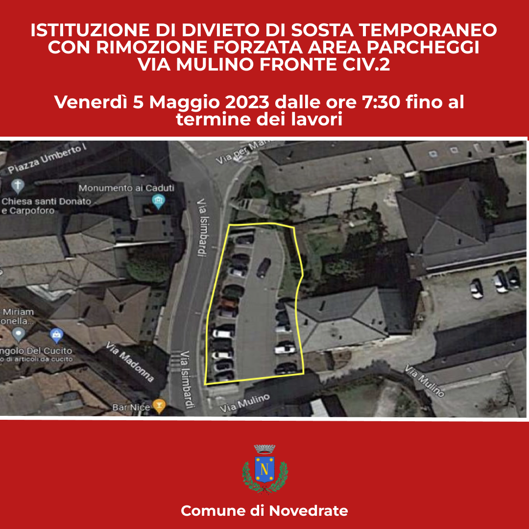 Istituzione di divieto di sosta temporaneo con rimozione forzata area parcheggi di Via Mulino fronte civ.2 per pulizia parcheggio e taglio manutenzione verde
